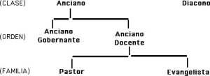 Nuestros estándares por consiguiente reconocen una clase de anciano, dividido en dos órdenes: anciano gobernante y anciano docente. Un anciano gobernante no se convierte en un anciano docente meramente porque el enseña una clase o da una prédica. Ni un anciano docente llega a ser un anciano gobernante porque el ejerce algunas funciones administrativas. La diferencia entre ellos no es una función particular en un momento dado. Ellos pertenecen a órdenes diferentes, según la posición mantenida por la PCA.